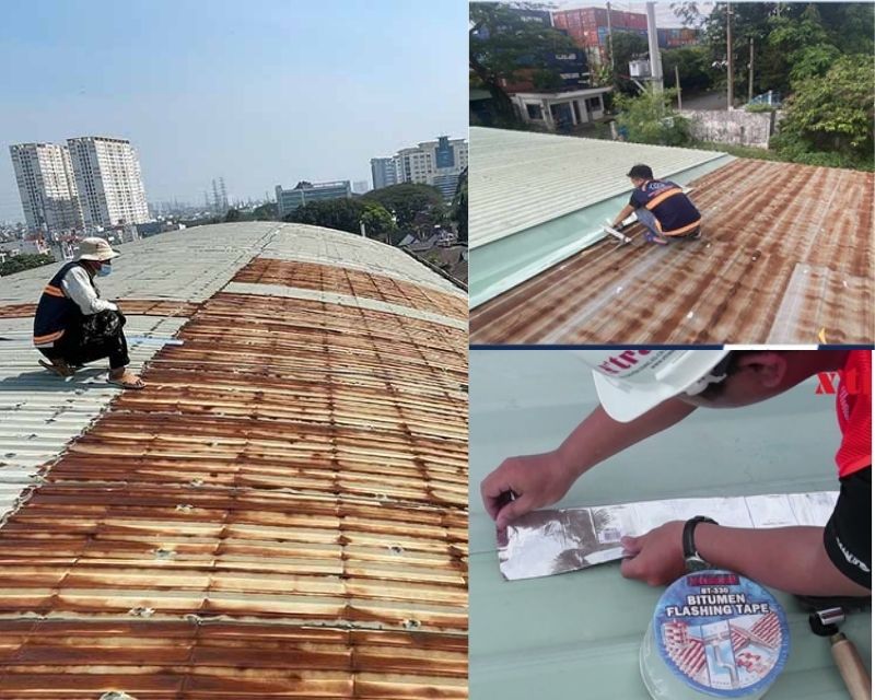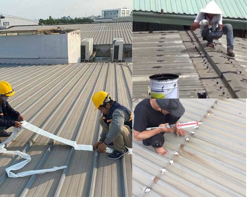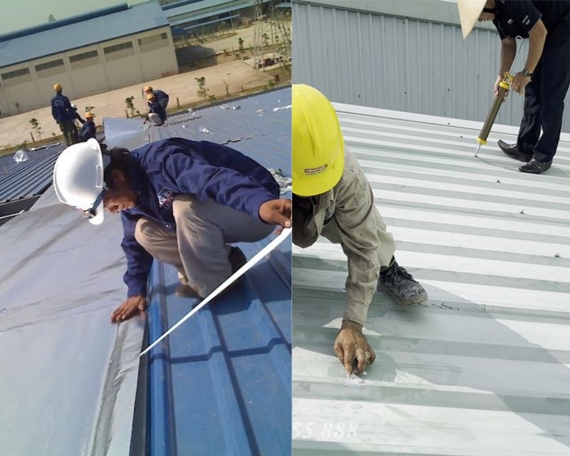 Đội ngũ HNDC đang xử lý dột thấm mái tôn bằng vật liệu chuyên dụng, đảm bảo chống thấm triệt để.