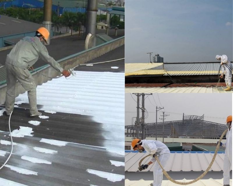 Thi công lớp sơn chống thấm PU cho mái tôn giúp chống tia UV và thấm nước.