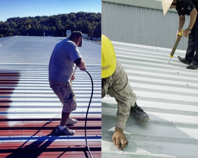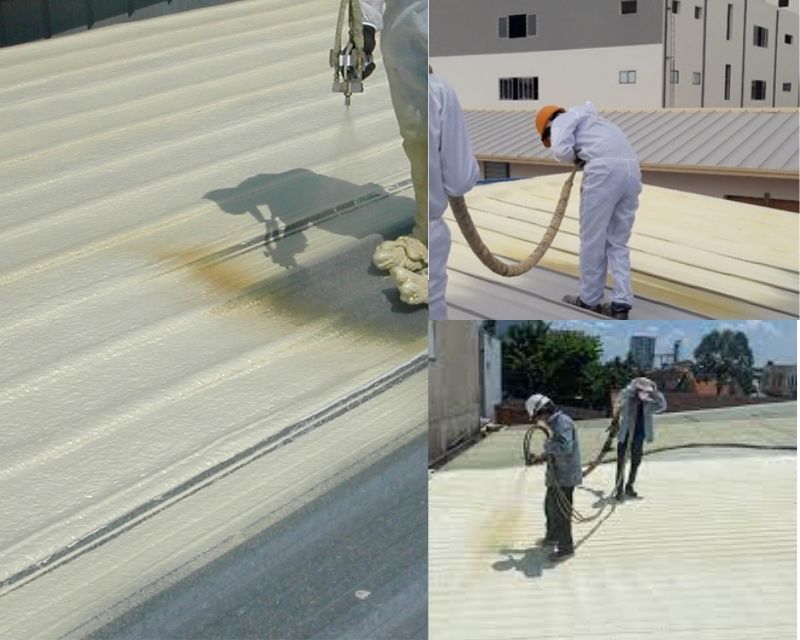 Thi công lớp sơn chống thấm PU cho mái tôn giúp chống tia UV và thấm nước.