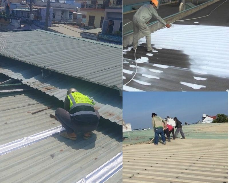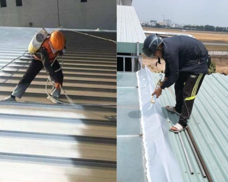 Phun hoặc lăn 2-3 lớp sơn chống thấm mái tôn bằng các loại sơn gốc PU, Acrylic hoặc Epoxy, có khả năng chịu nhiệt – chống tia UV.