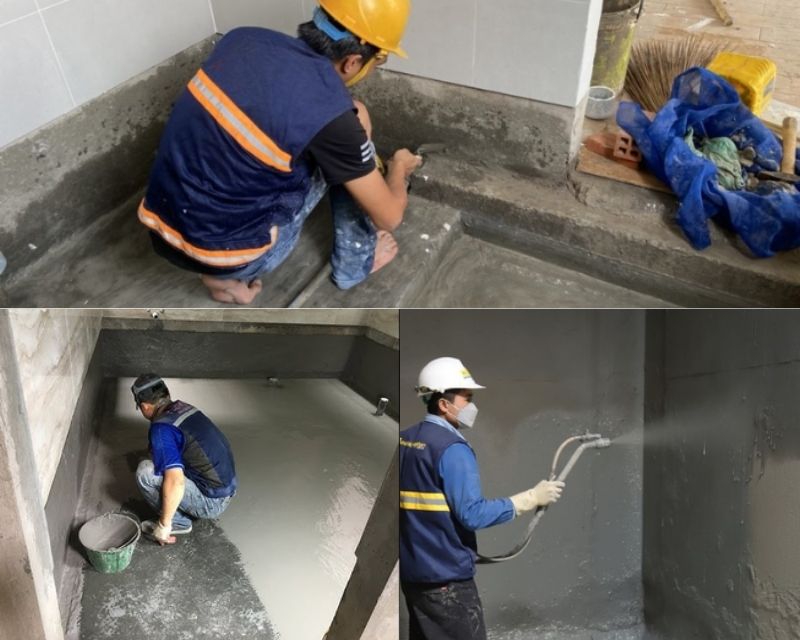 Thi công lớp chống thấm: Áp dụng màng chống thấm hoặc sơn cho sàn, tường, góc nối.