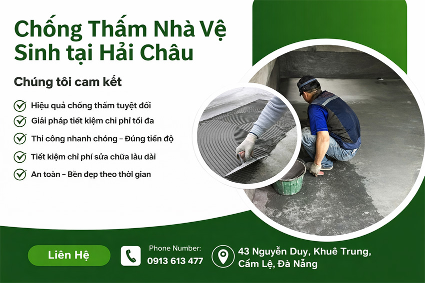 Dịch vụ chống thấm nhà vệ sinh Hải Châu thi công đúng quy trình hiện đại nhất, test ngâm 24–48h. Cam kết xử lý dứt điểm, hạn chế đục phá. Báo giá minh bạch...