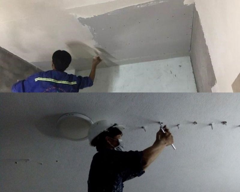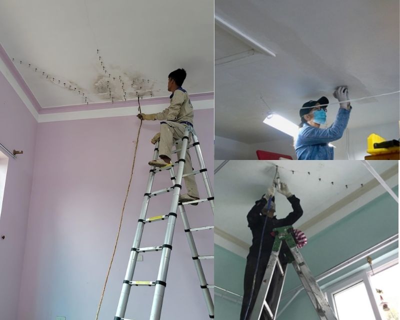 Đội thi công HNDC làm việc tại công trình trần nhà bị thấm nước